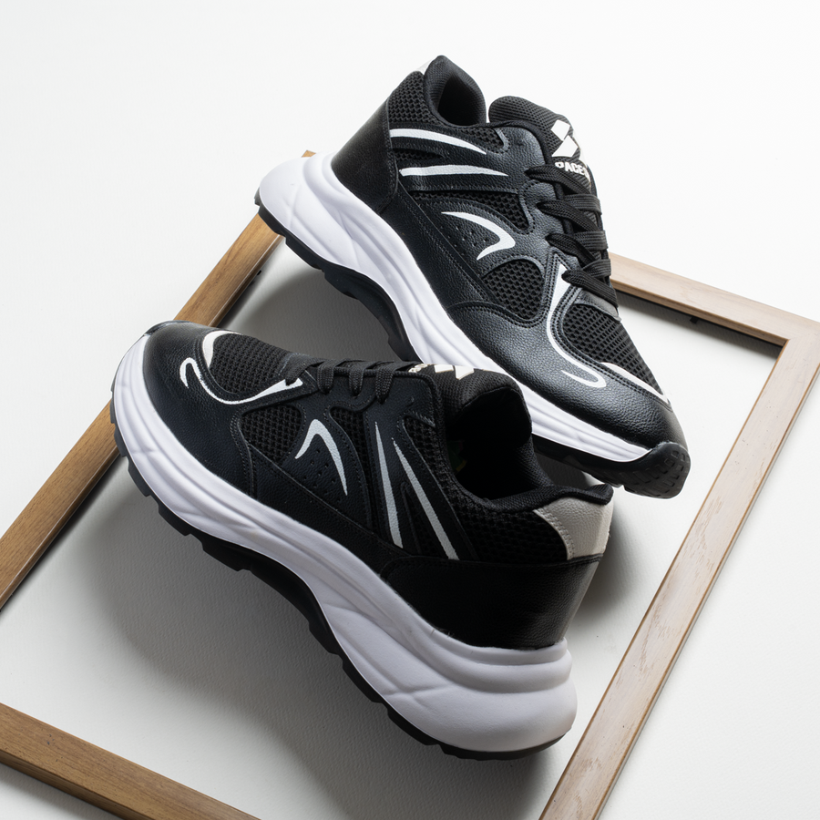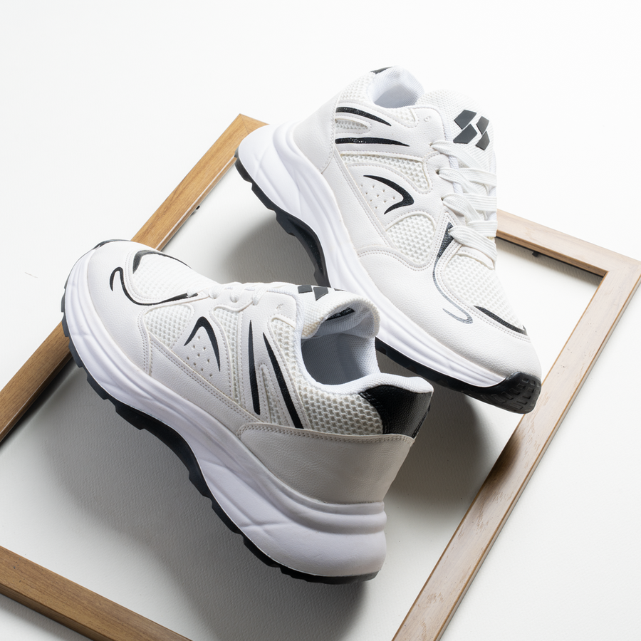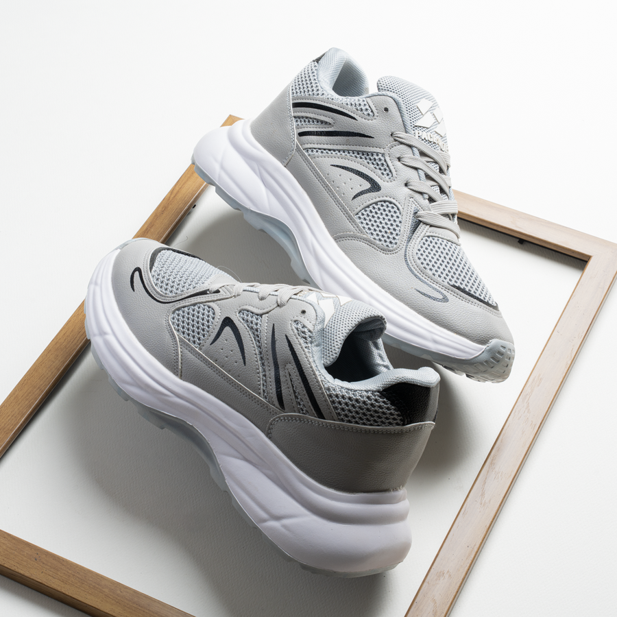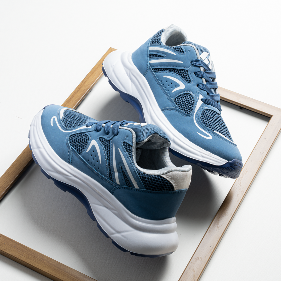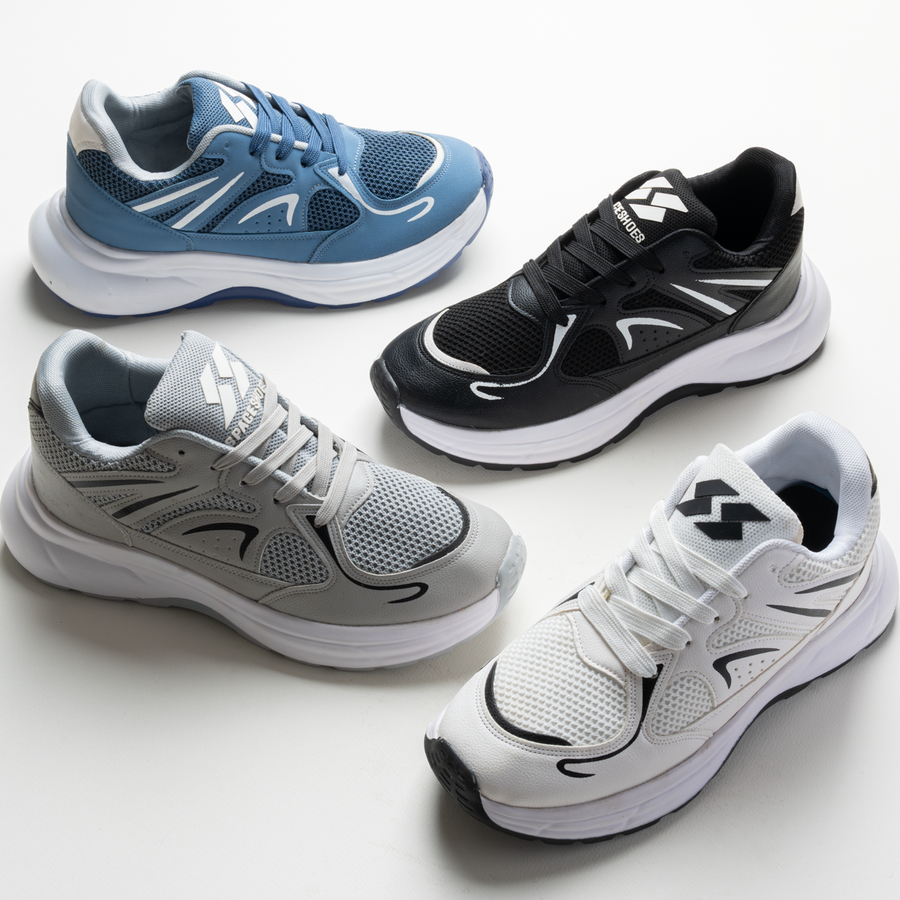 كوتشي رياضي رجالي عصري بخامة تريكو عالي الجودة مع جلد، نعل EVA خفيف ومرن لامتصاص الصدمات، مناسب للمشي الطويل والاستخدام اليومي.