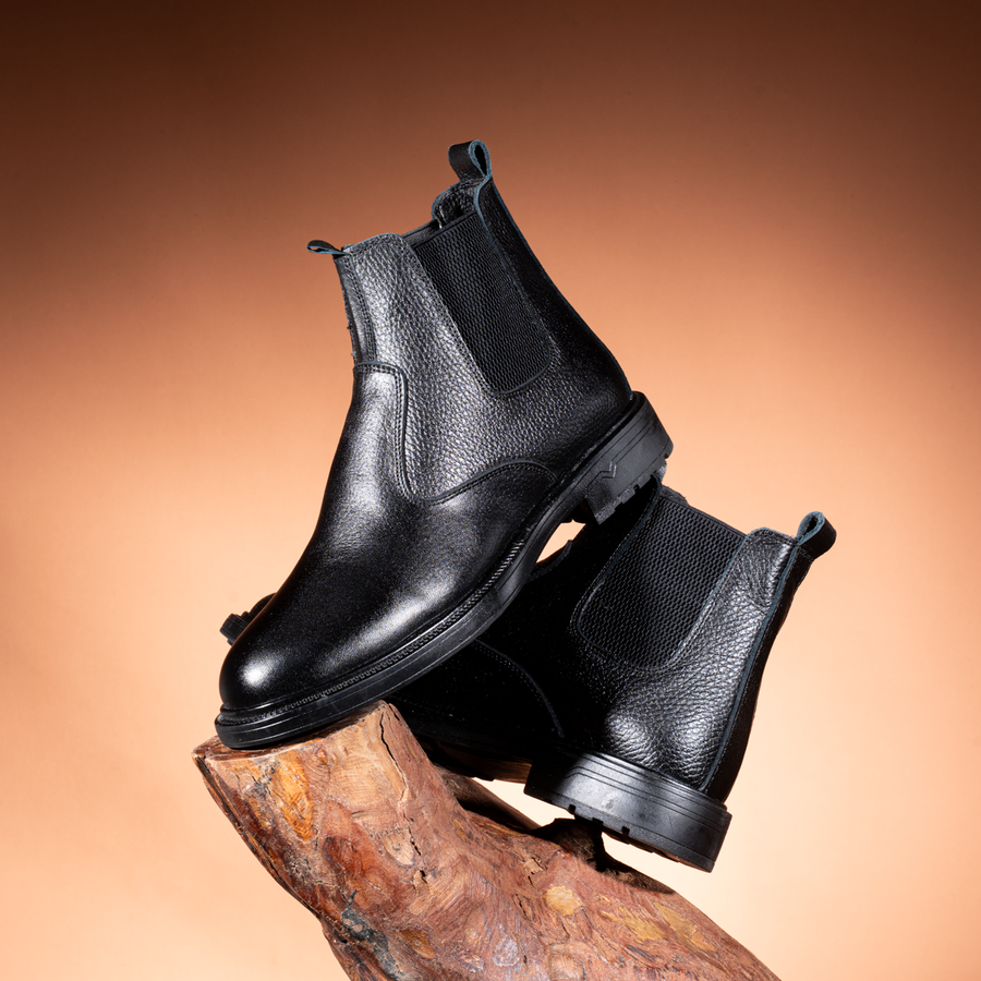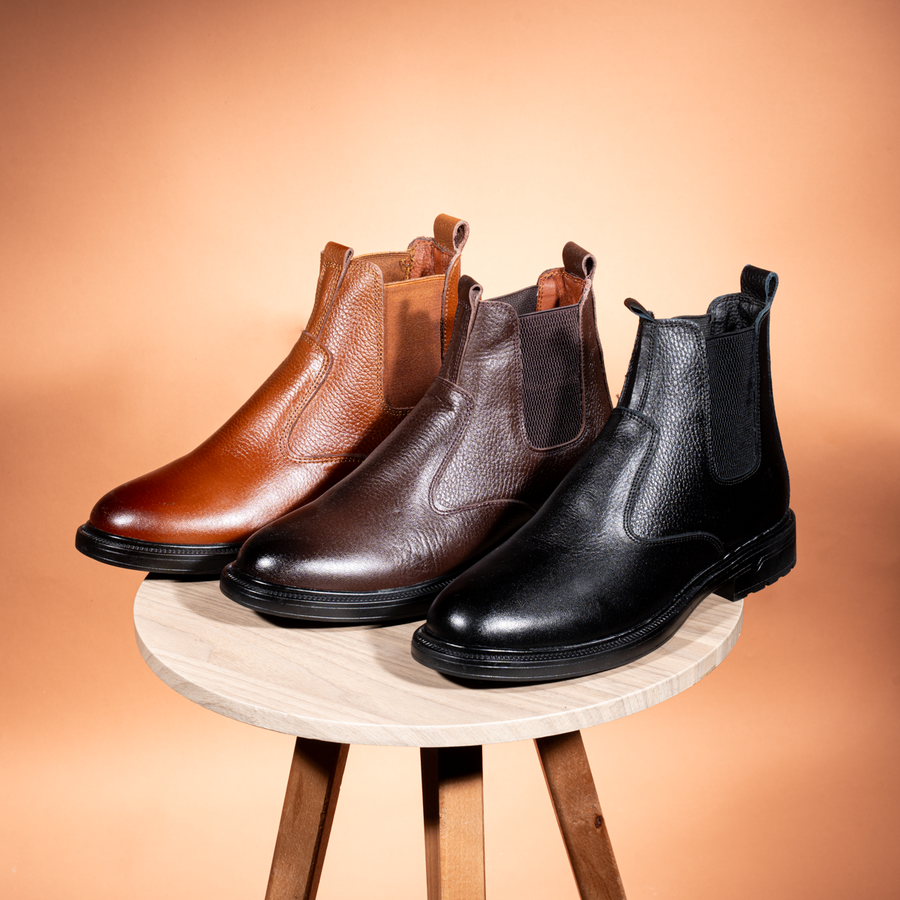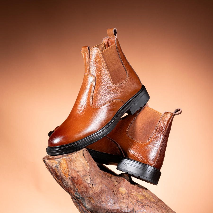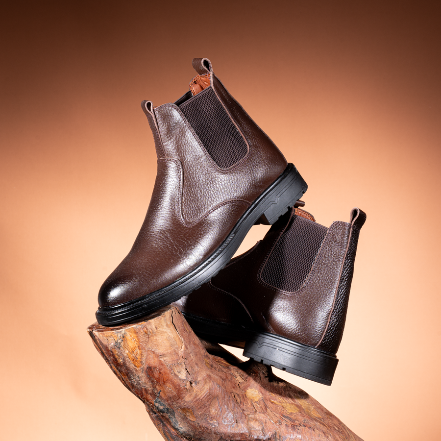 هاف بوت رجالي جلد مكسر طبيعي 100٪ بتصميم أنيق يجمع بين الكلاسيك والعملي. نعل رابر قوي ضد الانزلاق، فرش طبي مريح للمشي الطويل، واستك قوي لسهولة اللبس.